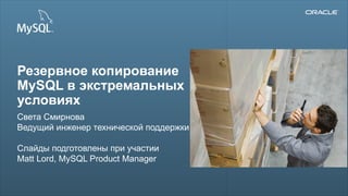 Документ представляет собой руководство по резервному копированию MySQL в условиях ограниченных ресурсов. Основное внимание уделяется методам, которые минимизируют влияние на производительность и временные затраты, включая использование специализированного инструмента MySQL Enterprise Backup. В нем также рассматриваются варианты резервного копирования при нехватке места и рекомендации по предотвращению блокировок.