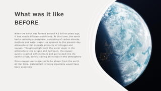 Cyanobacteria evolved around 2.7 billion years ago and were able to perform oxygen-producing photosynthesis. Over hundreds of millions of years, cyanobacteria steadily released oxygen into the oceans and atmosphere through photosynthesis. This Great Oxidation Event eventually led to oxygen replacing methane as a major component of the atmosphere between 2.4-2.1 billion years ago. This changed Earth's climate and chemistry forever, allowing for the evolution of aerobic metabolism and multicellular life.
