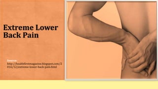 The document provides guidance on managing extreme lower back pain, advising initial rest and the use of ice, followed by heat after a few days. It emphasizes the importance of avoiding heavy lifting and gradually resuming exercise like walking and swimming after a couple of weeks, with the potential for physical therapy if pain persists. If pain lasts beyond 30 days or doesn't improve with basic treatments, further medical evaluation may be necessary.