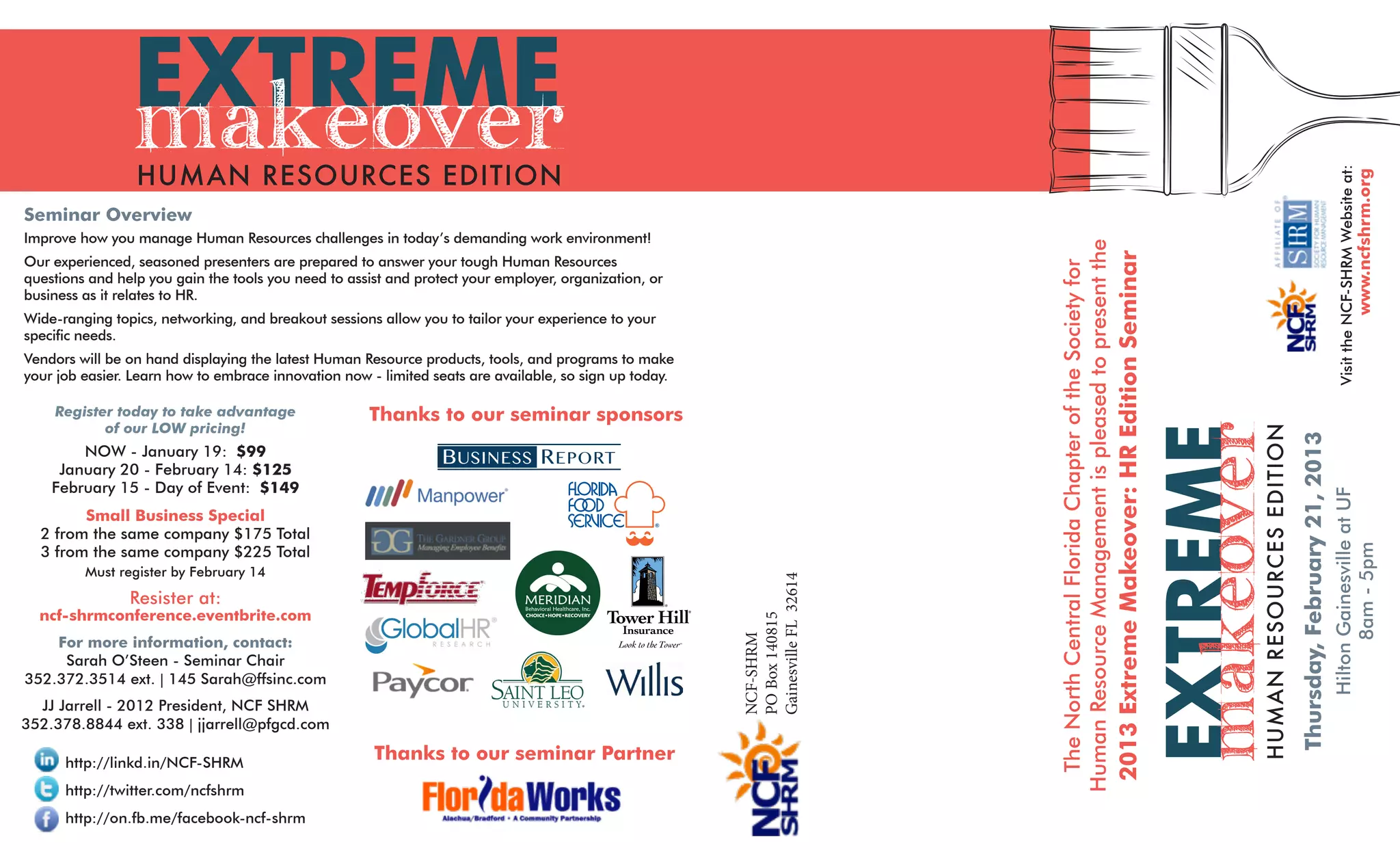 The document provides an overview and agenda for the 2013 Extreme Makeover: HR Edition Seminar. The seminar will cover a wide range of topics related to human resource management challenges. Experienced presenters will discuss tools and strategies to assist employers with HR issues. Vendors will also be in attendance to showcase HR products and programs. Participants can choose from breakout sessions on topics like retaining engaged employees, employment law updates, and leadership strategies. The keynote speaker will discuss the importance of teamwork and positive change. Registration information is provided.