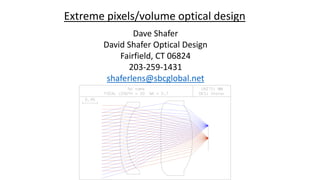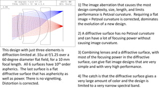 The document discusses advanced optical design concepts, focusing on the challenges of petzval curvature and how diffractive surfaces can mitigate these issues, allowing for high-performance, flat image designs. It highlights the beneficial effects of combining refractive and diffractive asphericity to independently control ray direction and phase, showcasing various design examples and their optical characteristics. The overall aim is to demonstrate the potential of refractive/diffractive aspheric combinations, emphasizing simplicity and compactness in new designs.