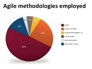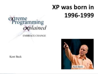 This document provides an overview of Extreme Programming (XP), an agile software development methodology. It discusses XP's history and features, which include short 2-week development cycles, pair programming, test-driven development, and frequent refactoring. The core principles of XP are also examined, such as incremental planning, small releases, simple design, and sustainable pace. Various phases of the XP process are outlined, from exploration to productionizing. Requirements are captured as scenarios and prioritized by the customer. Automated testing is a key practice in XP. Both advantages like collective code ownership and disadvantages like its unsuitability for large projects are noted.