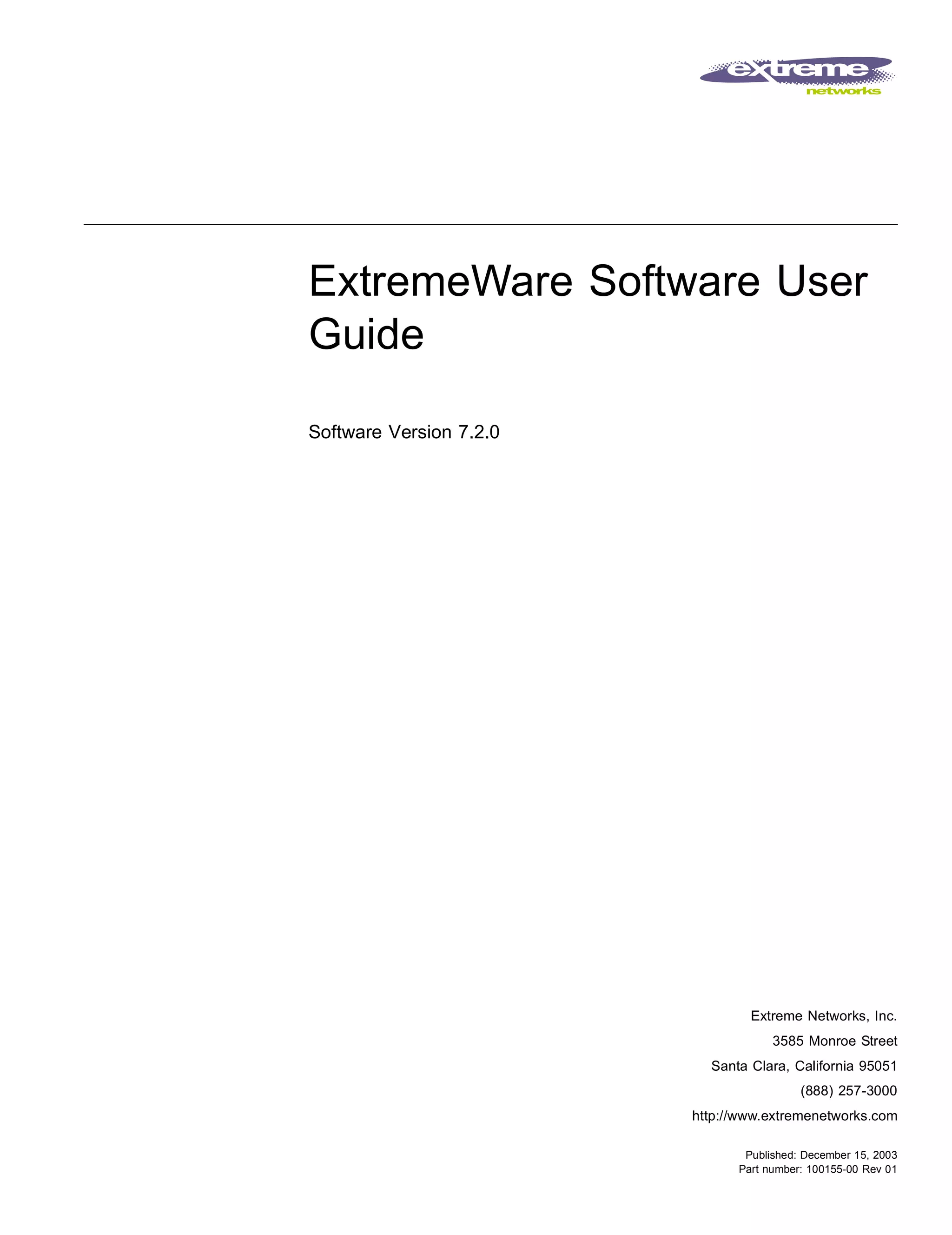 This document is the ExtremeWare 7.2.0 Software User Guide. It provides information about using the ExtremeWare software, including features like VLANs, spanning tree protocol, quality of service, routing, and security. It describes how to access the switch through the console, Ethernet management port, Telnet, SSH, and web interface. It also covers basic management tasks like configuring management access, DNS, ping, traceroute, and authentication methods.
