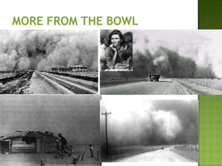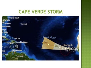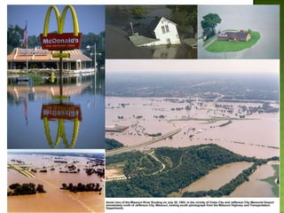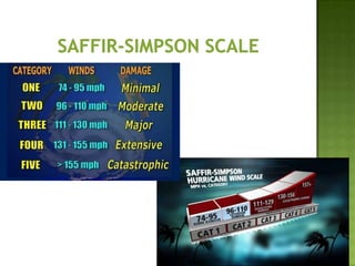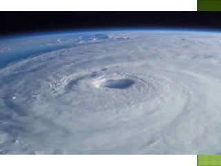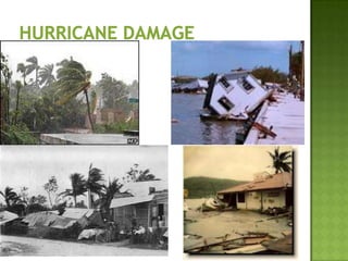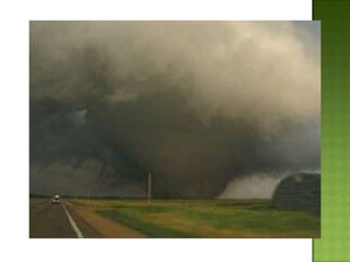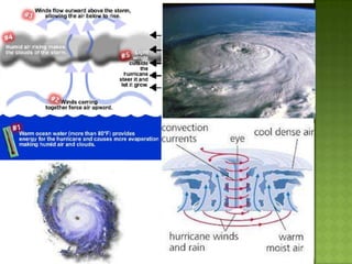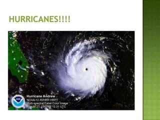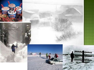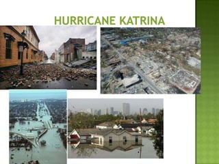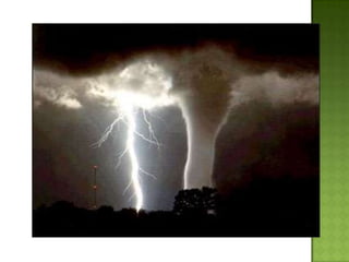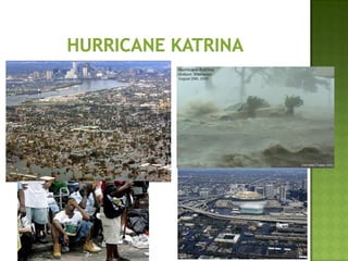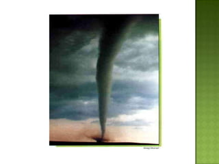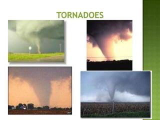 The document discusses various types of extreme weather events including hurricanes, tornadoes, blizzards, floods, and droughts. It provides details on the formation of hurricanes over warm ocean waters and specifics on major hurricanes like Andrew and Katrina. Tornadoes are described as powerful funnel clouds caused by colliding warm and cool air masses. The document also outlines significant blizzards, floods and droughts that have caused major damage and billions of dollars in losses across the United States.