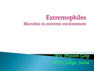 The document discusses different types of extremophiles, which are microorganisms that thrive in extreme environmental conditions. It describes thermophiles, which live at high temperatures; halophiles, which require high salt concentrations; methanogens, which live in anaerobic conditions; psychrophiles, which tolerate cold temperatures; barophiles, which thrive under high pressure; xerophiles, which withstand low water availability; and acidophiles, which survive in highly acidic environments. Each type is discussed in terms of its optimal living conditions and some examples of microorganisms that fall into each category.