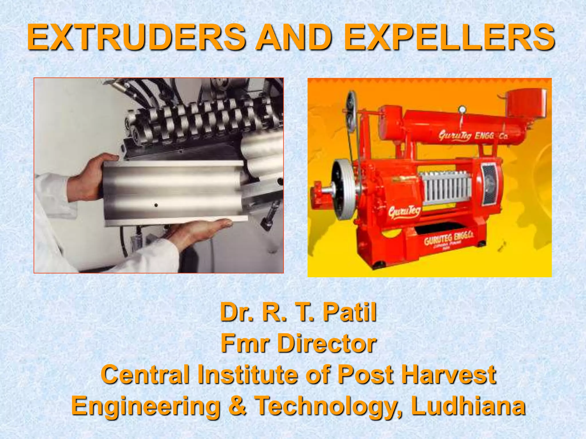 The document discusses different types of extruders and expellers used in food processing. It provides information on: