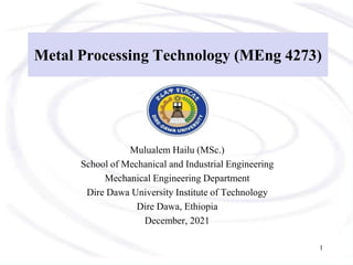 The document outlines various metal processing technologies, focusing on processes such as extrusion, drawing, forging, and sheet metalworking. It describes the mechanics, classifications, advantages, and limitations of these processes, including detailed explanations of defects and critical parameters affecting product quality. Additionally, it includes formulas for calculating forces and power requirements for each operation, emphasizing the significance of die design and machine types in metalworking.