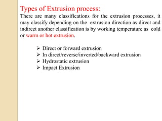 The document discusses different types of extrusion processes used to produce desired cross-sectional shapes from metal. There are several types including direct, indirect, impact, hydrostatic, hot, cold and warm extrusion. Direct extrusion involves compressing a metal billet using a ram to force it through a die, while indirect extrusion mounts the die to the ram so the material flows in the opposite direction of ram motion. Hydrostatic extrusion reduces friction by surrounding the billet with pressurized fluid. Hot extrusion softens the metal to allow more complex shapes. Defects can occur during extrusion like center bursting or surface cracking.
