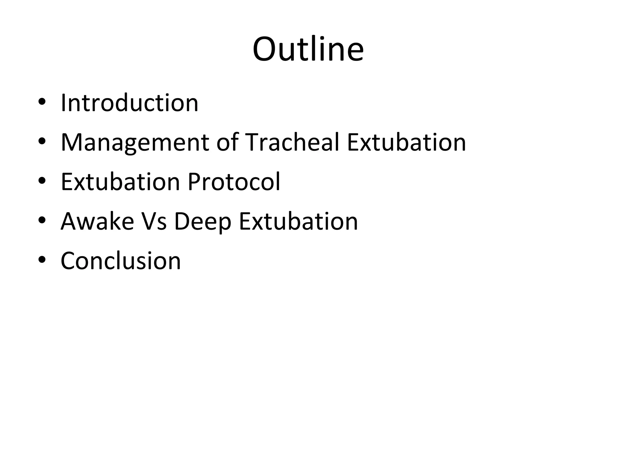 This document outlines the formulation of an extubation protocol for operating rooms and ICUs, detailing management steps, criteria for awake vs. deep extubation, and associated risks and benefits. It emphasizes the importance of proper technique in preventing complications during extubation, which is critical for patient recovery. The conclusion highlights the clinical judgment required in choosing the extubation method, noting the potential advantages and disadvantages of each approach.