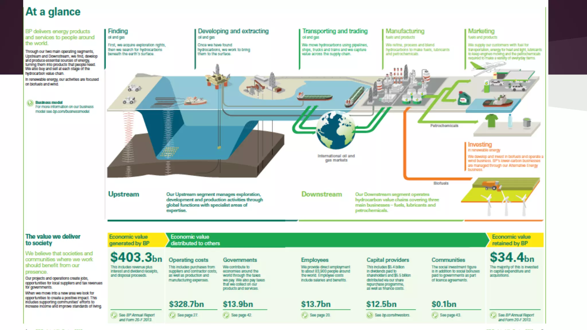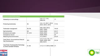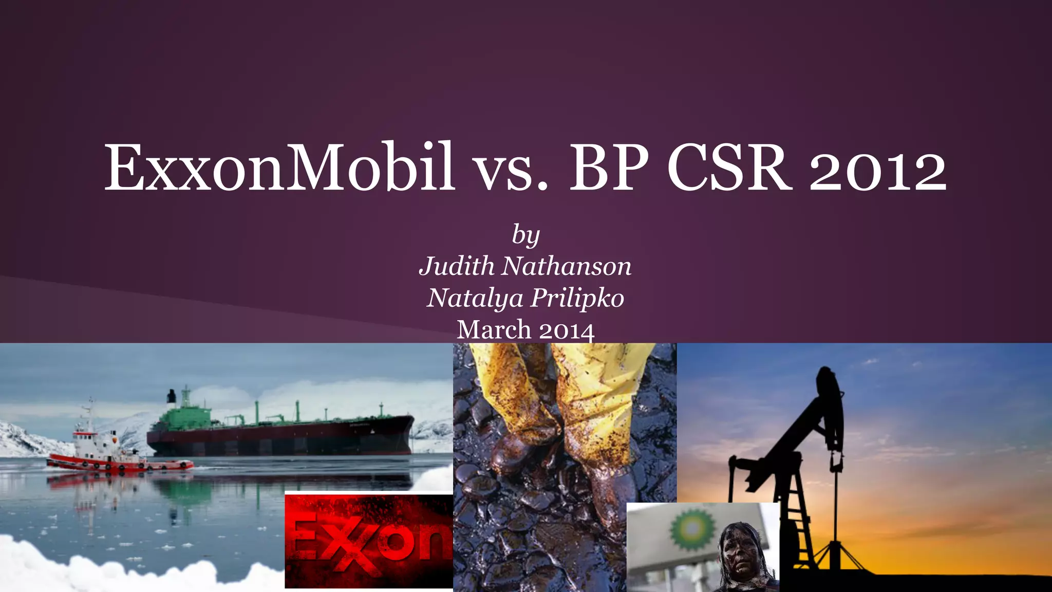 The document compares the corporate social responsibility reports of ExxonMobil and BP for 2012. It discusses both companies' visions, introductions, questions asked in the reports, reporting guidelines used, stakeholders, environmental policies, challenges faced, positions on fracking and climate change, reporting on oil spills, and details on internal and external audits. BP's reporting history and adherence to GRI and IPIECA guidelines is also reviewed, as well as what issues they included in their report such as the Gulf of Mexico spill and energy future outlook.