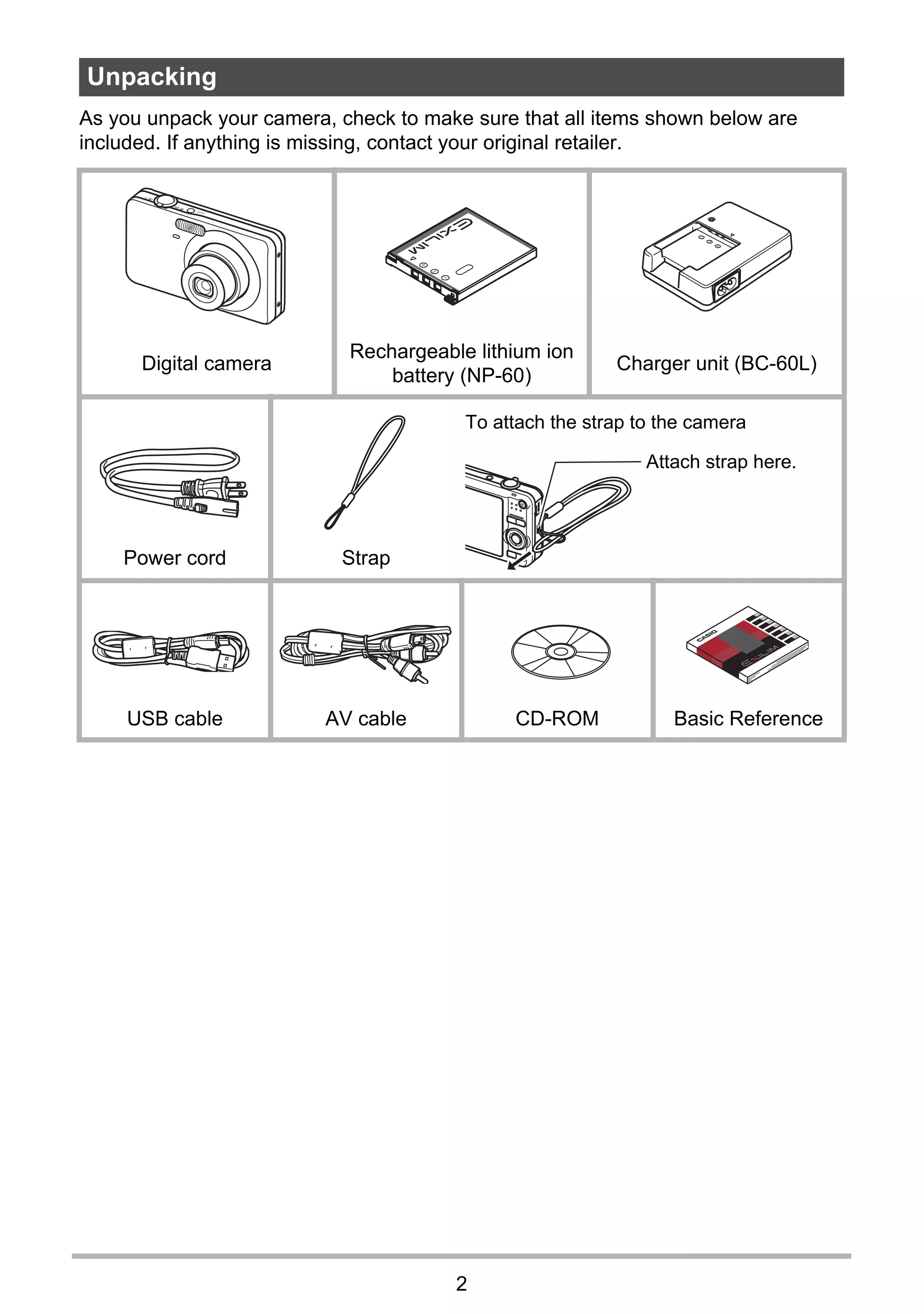 This document provides instructions for using a CASIO digital camera. It begins by listing what is included in the package and instructing the user to charge the battery before initial use. It then provides directions for basic camera functions like taking snapshots, viewing images, and deleting files. Additional sections cover more advanced topics such as recording movies, using scene recognition modes, customizing camera settings, and more. The document aims to help new users get started with the key functions of the camera and learn more advanced techniques.