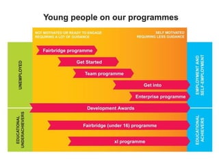 The document highlights the 'Young People First' model by Inspiring Young Lives, which focuses on guiding young individuals to the appropriate programs for optimal outcomes. It shows statistics related to client support across various regions and outlines challenges faced, such as ensuring shared understanding among staff and mapping outcomes. Proposed solutions include visually defining the young person's journey and conducting further research.