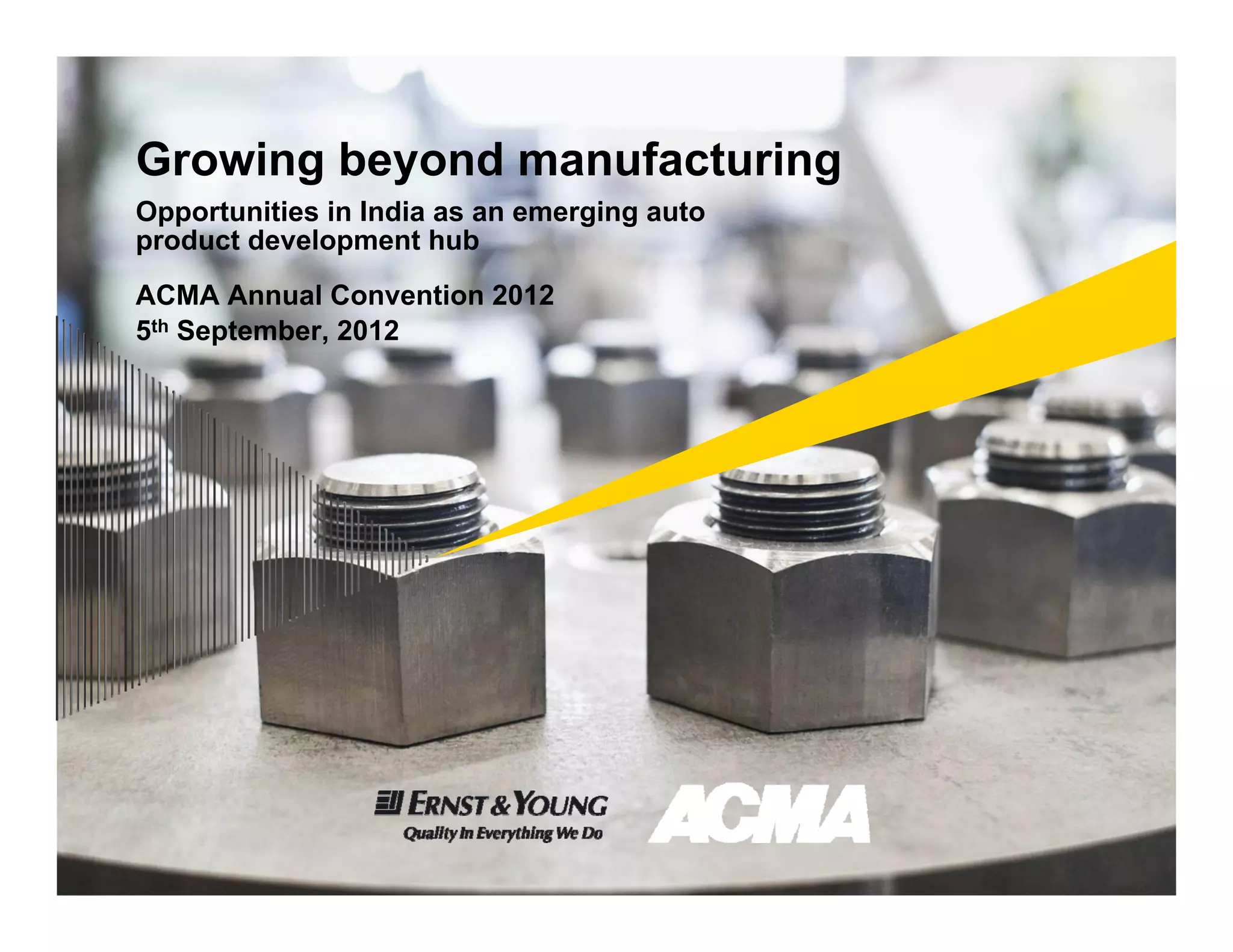 This document discusses India's potential to become a global automotive product development hub. It notes that while India is emerging as a large manufacturing hub for small cars, it still lacks end-to-end product and process development capabilities. It outlines three paths suppliers have taken - Dependents who collaborate with OEMs, Explorers who set up design cells, and Visionaries who invest heavily in integrated design and manufacturing. It argues for increased collaboration between OEMs, suppliers, and academic institutions to develop India's automotive innovation ecosystem and testing infrastructure to global standards.