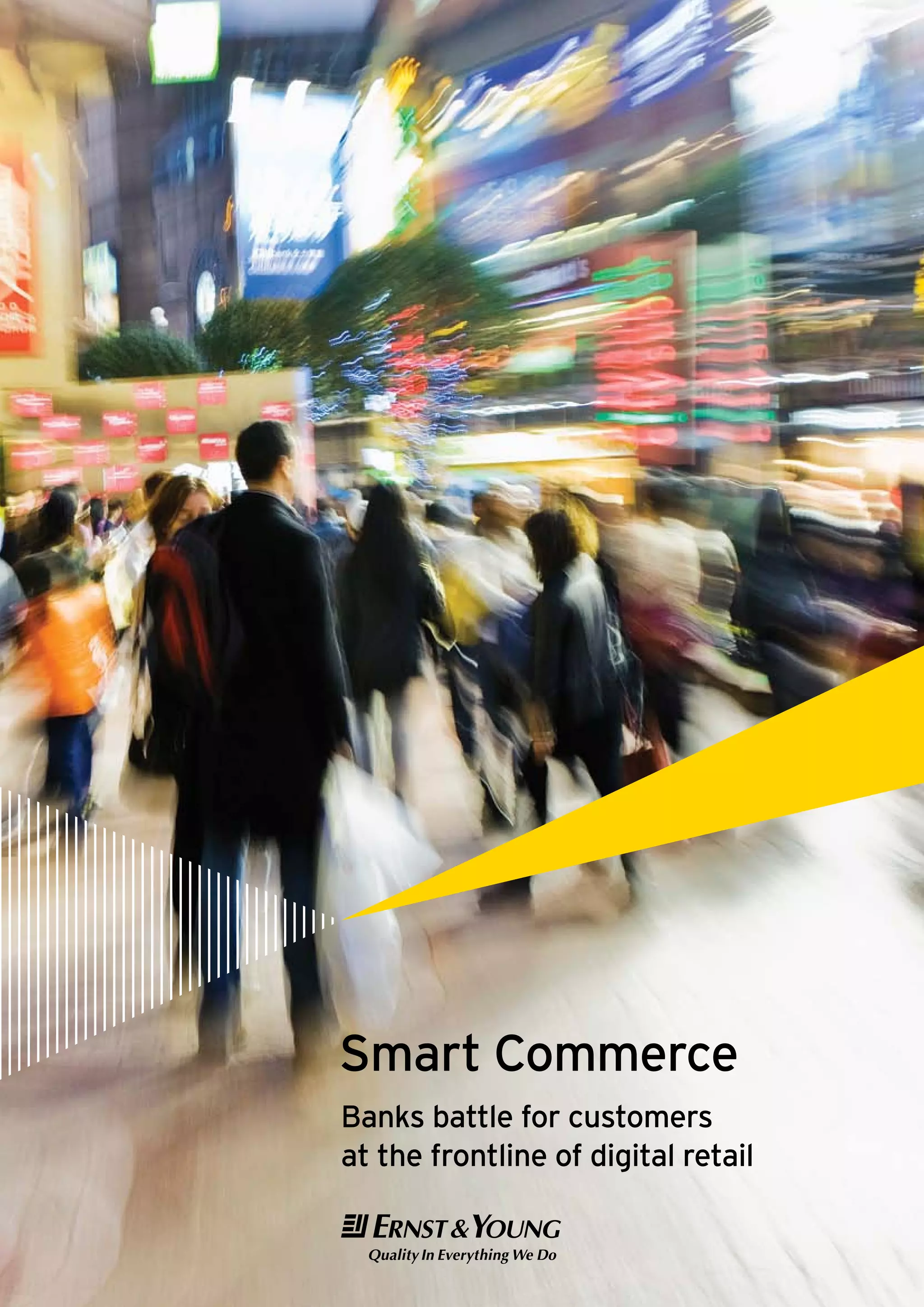 Banks see Smart Commerce as a growing threat that could distance them from customers. Smart Commerce is defined as involving digital payment methods that simplify purchases and enriched communication between merchants and consumers using mobile technology. It is driven by demand from both consumers and merchants, and by large profit pools outside of just payments, particularly merchant sales promotions. Many banks believe Smart Commerce will become widespread within two years and pose the main risk of intermediating banks and reducing their relevance in consumer commerce.