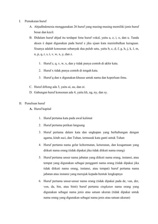 Dokumen tersebut membahas tentang penggunaan huruf dalam bahasa Indonesia dan penulisan kata, termasuk jenis huruf, penulisan huruf kapital dan miring, pemenggalan kata, penulisan angka, tanda baca, dan penulisan serapan kata asing.