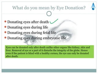 This document is an eye donation quiz that aims to spread awareness about eye donation. It contains multiple choice questions about various aspects of eye donation, such as who can donate eyes, what parts of the eye are donated, the process of eye donation after death, and the role of eye banks. The key points are that eyes can only be donated after death, the cornea is the part that is donated to help restore sight to the blind, and eye banks coordinate between donors and eye hospitals to facilitate transplants within 6 hours of death.