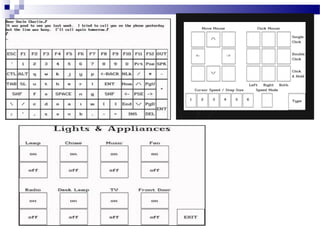 This document discusses an eye gaze communication system that allows users to control devices and communicate by looking at on-screen keys and menus. It works by using a camera below a monitor to track a user's eye movements as they look at different areas of the screen. Some key points covered include how the system operates, the types of functions and commands it can be used for, requirements for users, and recent advancements in portable eye tracking technologies.