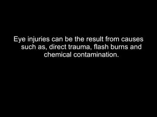 Eye injuries can result from direct trauma, flash burns, or chemical contamination and may cause permanent visual impairment. Signs of eye injuries include pain, impaired or lost vision, swelling or closure of the eye, blood or fluid loss from the eye, light sensitivity, bleeding within the eye, or visible foreign objects. Management depends on the type of injury but generally involves flushing the eye with water, covering it, not applying pressure, seeking medical advice, and avoiding putting anything in the eye.