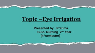 The document presents a seminar on eye irrigation, detailing the procedure of flushing the eye with saline to remove harmful substances. It covers the purpose, indications, contraindications, complications, and necessary equipment for eye irrigation, along with guidelines and steps for the procedure. The presentation emphasizes the nursing responsibilities involved in performing eye irrigation safely and effectively.