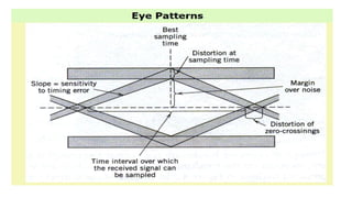 The eye pattern is a simple way to measure intersymbol interference (ISI) and noise in a signal. It is generated by overlapping each signal element in a system, such as a binary system. An eye pattern is often used to monitor the performance of baseband signals. A high signal-to-noise ratio will result in an eye pattern where the best time to sample is when the eye opening is largest, the maximum distortion and ISI are indicated by the vertical width at sampling time, the noise margin is proportional to the width of the eye opening, and the sensitivity to timing errors is determined by the rate of closure of the eye as the sampling time is varied.