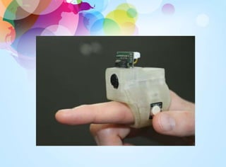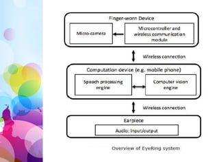 The document discusses the 'eyering,' a finger-worn device designed to assist visually impaired individuals through various applications, including navigation and currency recognition. It outlines the technology behind the eyering, such as its embedded camera and software for processing visual information, enabling users to interact with their environment. Future applications include reading printed materials and enhancing tourism experiences with gesture-based navigation.