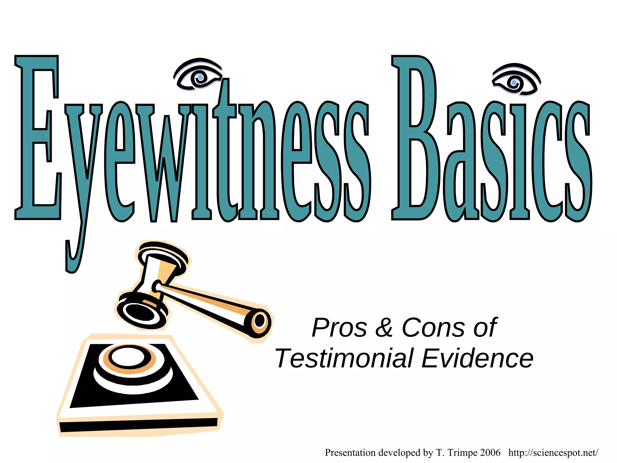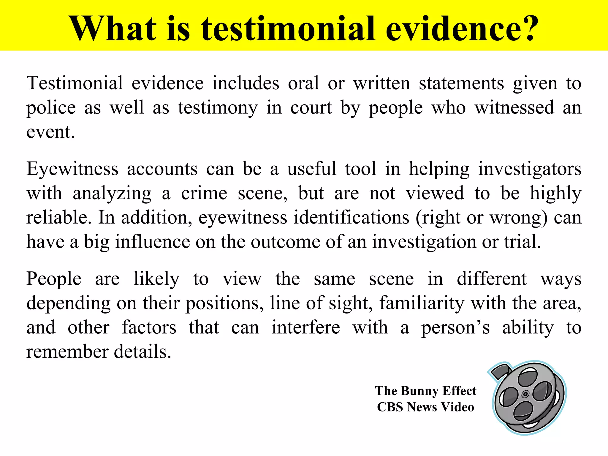 Testimonial evidence includes eyewitness accounts and statements given to police, which can provide useful information but may not be highly reliable. Eyewitness identifications can strongly influence investigations and trials, but people's memories of events can be impacted by various factors like their perspective and stress. Creating composite sketches with software that accounts for facial features can help investigators identify suspects based on eyewitness descriptions.