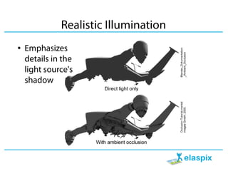 The document discusses various techniques for realistic 3D rendering in real-time and non-real time contexts, including reflections, caustics, hair rendering, lighting and shadows. It compares the speed and quality of GPU real-time rendering to CPU rendering with and without baked textures or dynamic reflections. The document also discusses using render farms in the cloud to distribute rendering work for movies and games across thousands of CPUs and GPUs.