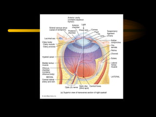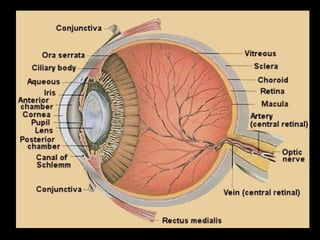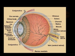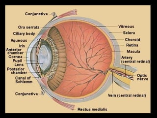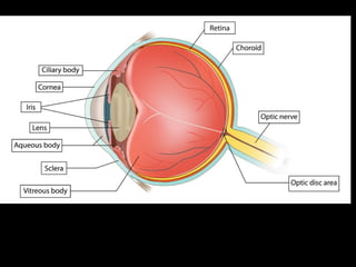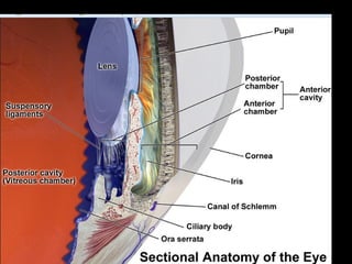 The eyeball has three tunics - the outer fibrous tunic (cornea and sclera), middle vascular tunic (choroid coat, ciliary body, and iris), and inner nervous tunic (retina). The iris functions like an aperture, enlarging in dim light and contracting in bright light. Its opening is the pupil. Behind the lens is the vitreous humor, a transparent gel filling the eyeball, and behind that is the retina which contains light-sensitive nerve endings that carry signals to the optic nerve.