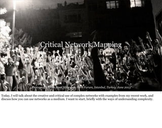 Burak Arıkan discusses the creative and critical use of complex networks, illustrating how network mapping can provide insights into various interconnected systems, from telecommunications to social dynamics. He highlights the historical evolution of network systems and emphasizes the importance of visualizing and measuring these networks for understanding power dynamics in contemporary society. Through examples of his own work, Arıkan explores prediction, traversal, and collective mapping as strategies to analyze and engage with complex networks.