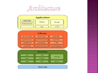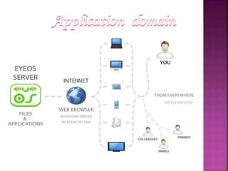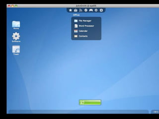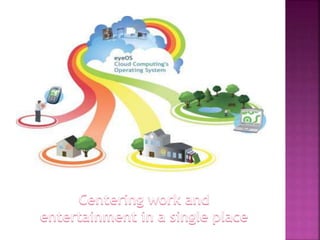 EyeOS is an open source online operating system that allows users to access files and applications from any internet-connected device. It functions similarly to a desktop OS but is browser-based. EyeOS uses PHP, XML, and JavaScript and includes applications like a word processor, calendar, and file manager. It aims to enable collaboration and ensure data is not lost if a user's system fails.