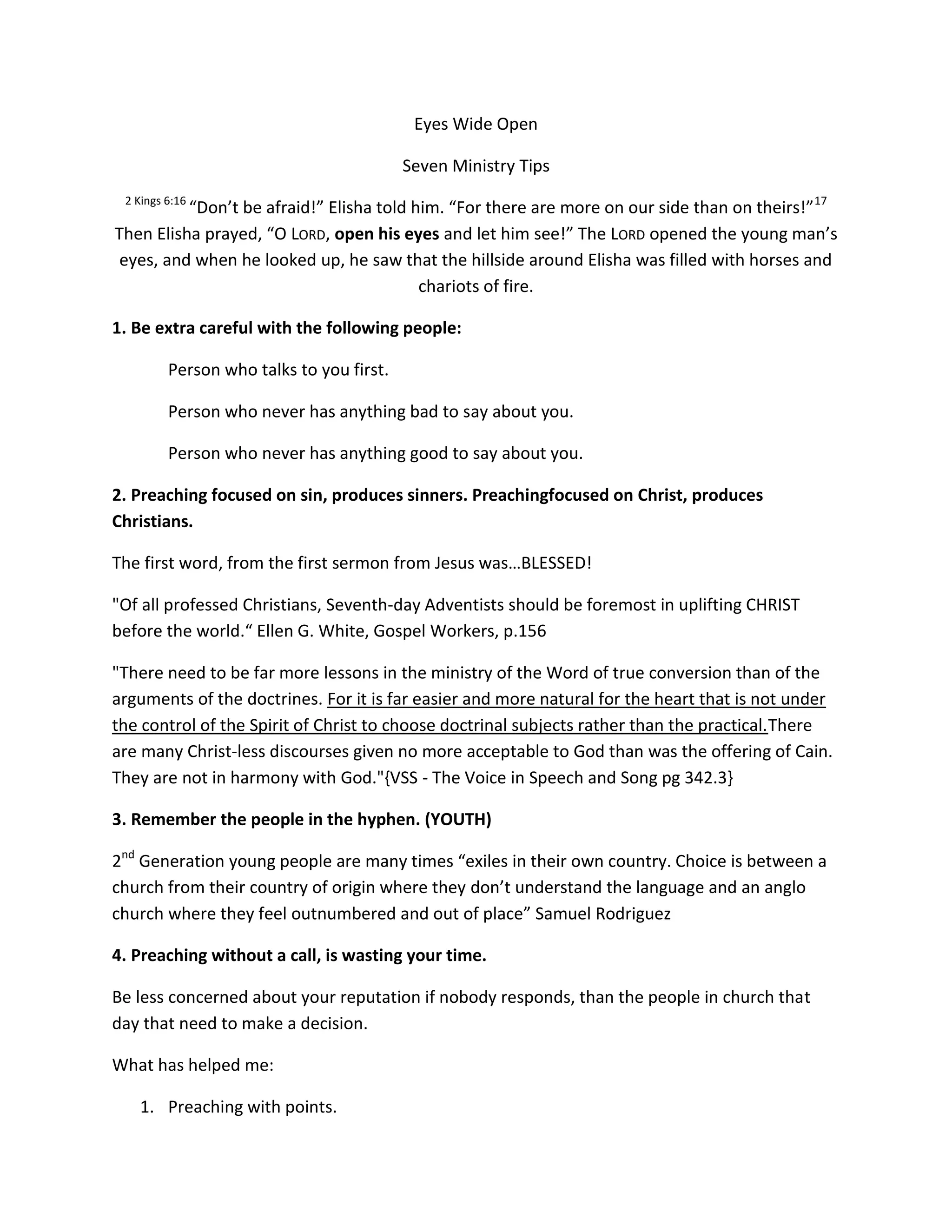 This document provides 7 tips for ministry: 1) Be careful of flatterers and critics. 2) Preach Christ rather than sin to produce Christians. 3) Uplift Christ to the world. 4) Focus on true conversion rather than just doctrines. 5) Invest in youth. 6) Only preach with a call, not for reputation. 7) Take margins for self-care and invest in mentoring relationships.