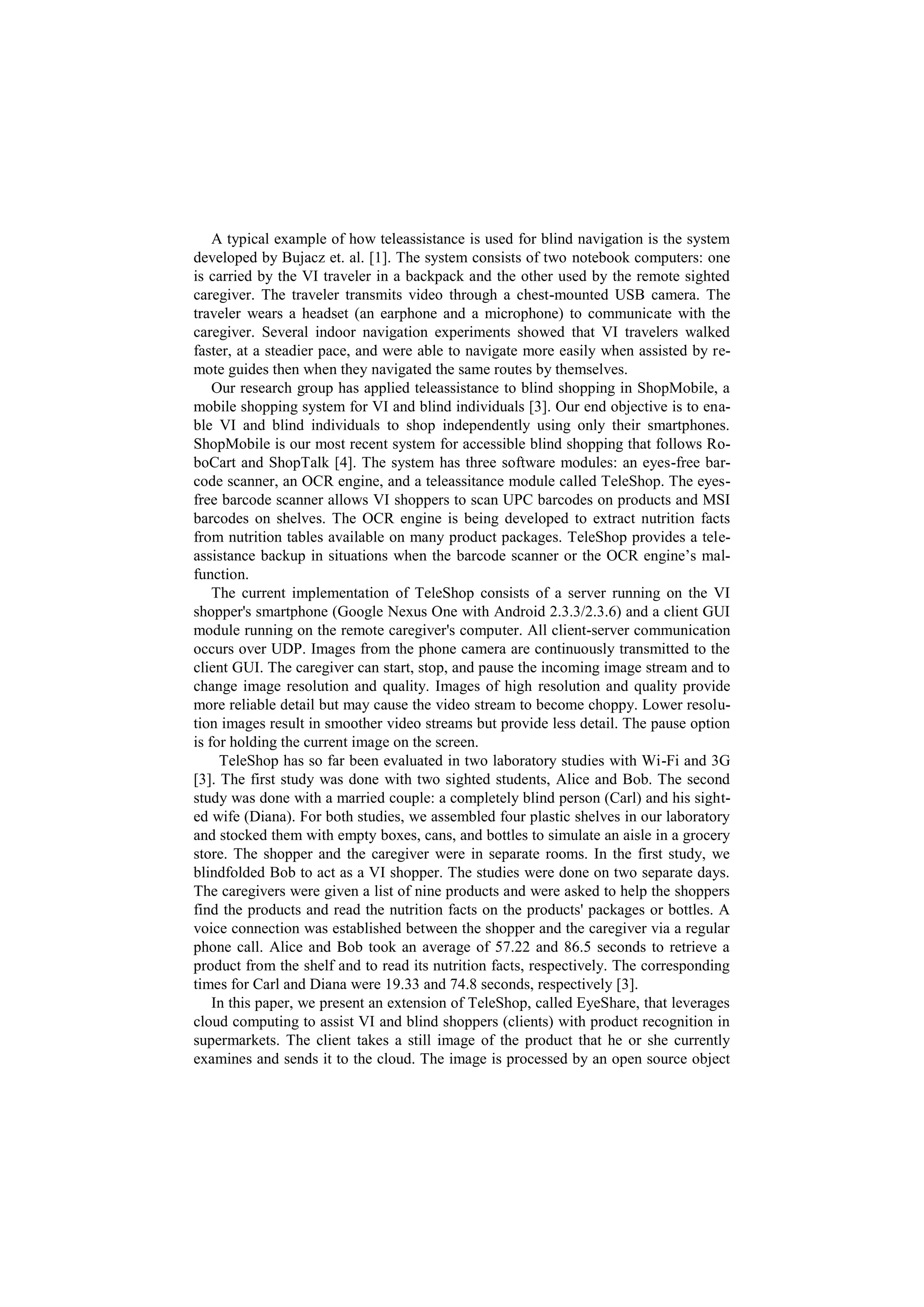This document describes a cloud computing framework that uses image recognition and remote assistance to help blind individuals identify products while grocery shopping. A blind person takes a photo of a product with their smartphone, which is sent to a cloud server for image matching. The top 5 matches are then sent to a sighted assistant for verification. If a match is incorrect, the assistant provides the right name either by voice or text. The system was tested in the lab and a supermarket, showing it can help blind people identify products independently with help from remote sighted assistants.