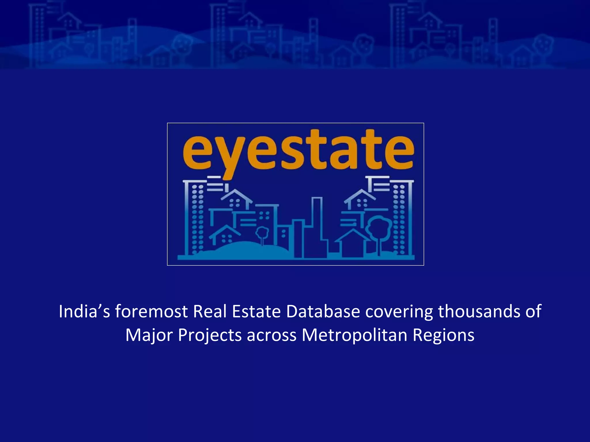 Eyestate is India's premier real estate database providing comprehensive information on thousands of projects across major metropolitan regions. It offers detailed data on residential, commercial, and retail segments, with features such as dynamic maps, project-specific data, and quarterly updates. The platform is a collaborative effort between Indicus Analytics and Knight Frank, focusing on data validation and market trends to support real estate decision-making.
