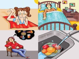 The document provides information about health, body care, diet, exercise, stress management, and medical treatment. It includes questions about living a healthy lifestyle and leading a balanced life. Statistics are presented about where women give birth, and questions are asked about medical care choices. Stress factors are discussed for a person named Carol. Laura Smith and Jane Hornby are contrasted in how they manage self-care, with Laura doing everything herself while Jane has others help her. Medical treatments a Mrs. Robinson received are discussed.