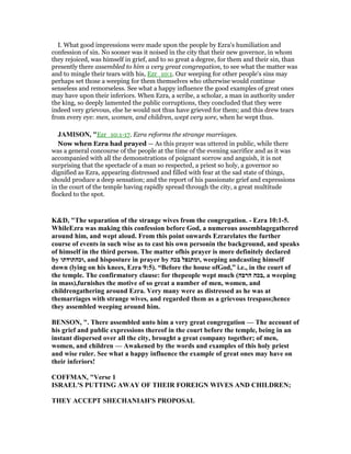Ezra prayed and confessed the sins of the Israelites, which deeply affected a large crowd, causing men, women, and children to weep bitterly alongside him. Shechaniah proposed a covenant to put away foreign wives and their children to correct the transgressions against God, reflecting the community's recognition of the gravity of their actions. This movement towards reform, although harsh, aimed to preserve the purity of their faith and identity in a challenging environment.