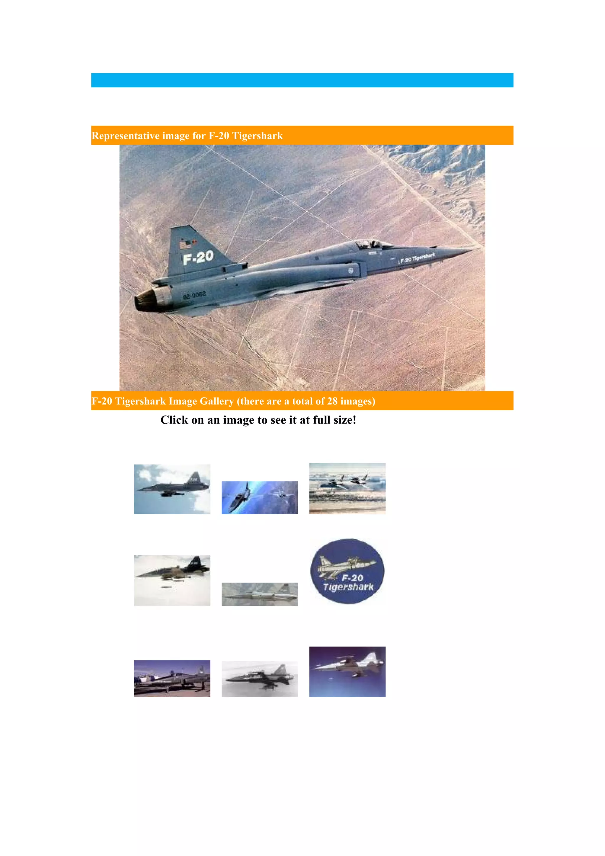 The Northrop F-20 Tigershark was a privately developed fighter aircraft intended to compete with the F-16. It began as an evolution of the F-5 Freedom Fighter but used a more powerful engine. Three prototypes were built in the 1980s but no major orders were placed, as customers preferred the F-16. The project was ultimately cancelled after six years due to lack of sales. While its performance was comparable to early F-16 models, the F-20 lacked expansion capability and lost out to the newer and more supported F-16.