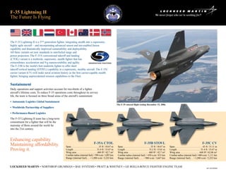 The F-35 Lightning II is a 5th generation stealth fighter jet that comes in three variants - the F-35A conventional takeoff and landing variant, the F-35B short takeoff/vertical landing variant, and the F-35C carrier variant. It integrates stealth, advanced sensors and networking capabilities. Sustainment is a focus, with autonomic logistics, a global supplier network, and performance-based logistics aimed at reducing lifetime costs. The F-35 is intended to be the mainstay fighter for air forces around the world well into the 21st century.