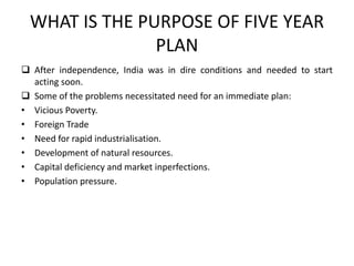 The document summarizes the key aspects of India's 4th Five Year Plan presented by Prakash Chandra Mallick. It discusses that the 4th plan was initially focused on industrial development but funds had to be diverted for war needs. The objectives were to reform government spending, facilitate export growth, and alter socio-economic structure due to droughts and wars. The total outlay was Rs. 24,882 crores with priority on education expansion, tribal and backward class welfare, and making agriculture the main focus through initiatives like the Green Revolution.