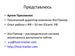 Документ представляет обзор функционального языка программирования F# и его применение в разработке многопоточных систем. Обсуждаются проблемы традиционного программирования, такие как блокировки и управление состоянием, и предлагается функциональный подход как решение для создания эффективных и масштабируемых приложений. Также описываются основные особенности F# и его интеграция с .NET, а также методы асинхронной обработки и параллелизма.