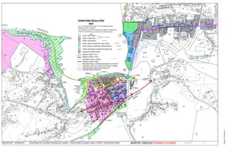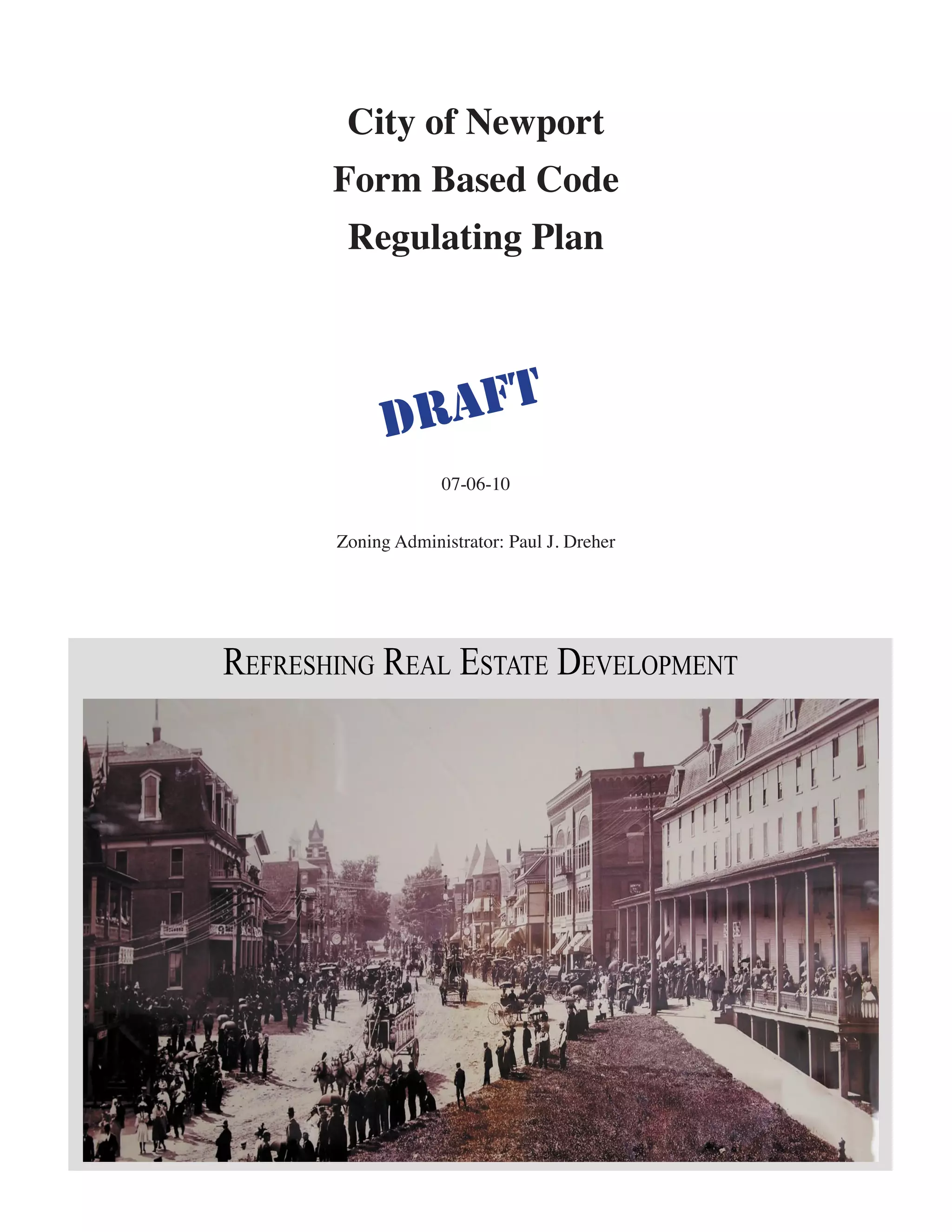 This document is a draft form based code for the city of Newport, Vermont. It includes definitions, an overview of the code and administration process, requirements for streetscapes, lots, blocks, streets, alleys, buildings, parking and retail. It also includes graphic standards for six different street/building form types and a regulating map of downtown Newport. Additional sections provide details on possible frontage types, street types and standards, secondary street types, and proposed corridors, alleys and recreation paths.