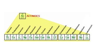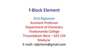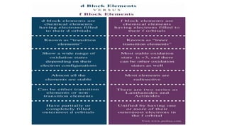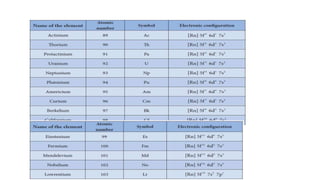 The document provides an overview of f-block elements, specifically lanthanides and actinides, detailing their electronic configurations, oxidation states, and properties. Lanthanides, characterized by a common +3 oxidation state and a gradual lanthanoid contraction, show decreasing ionic and atomic radii across the series, affecting their chemical behavior and separation. Actinides, with more variable oxidation states, are primarily recognized for their radioactive properties and applications in energy generation and nuclear technology.