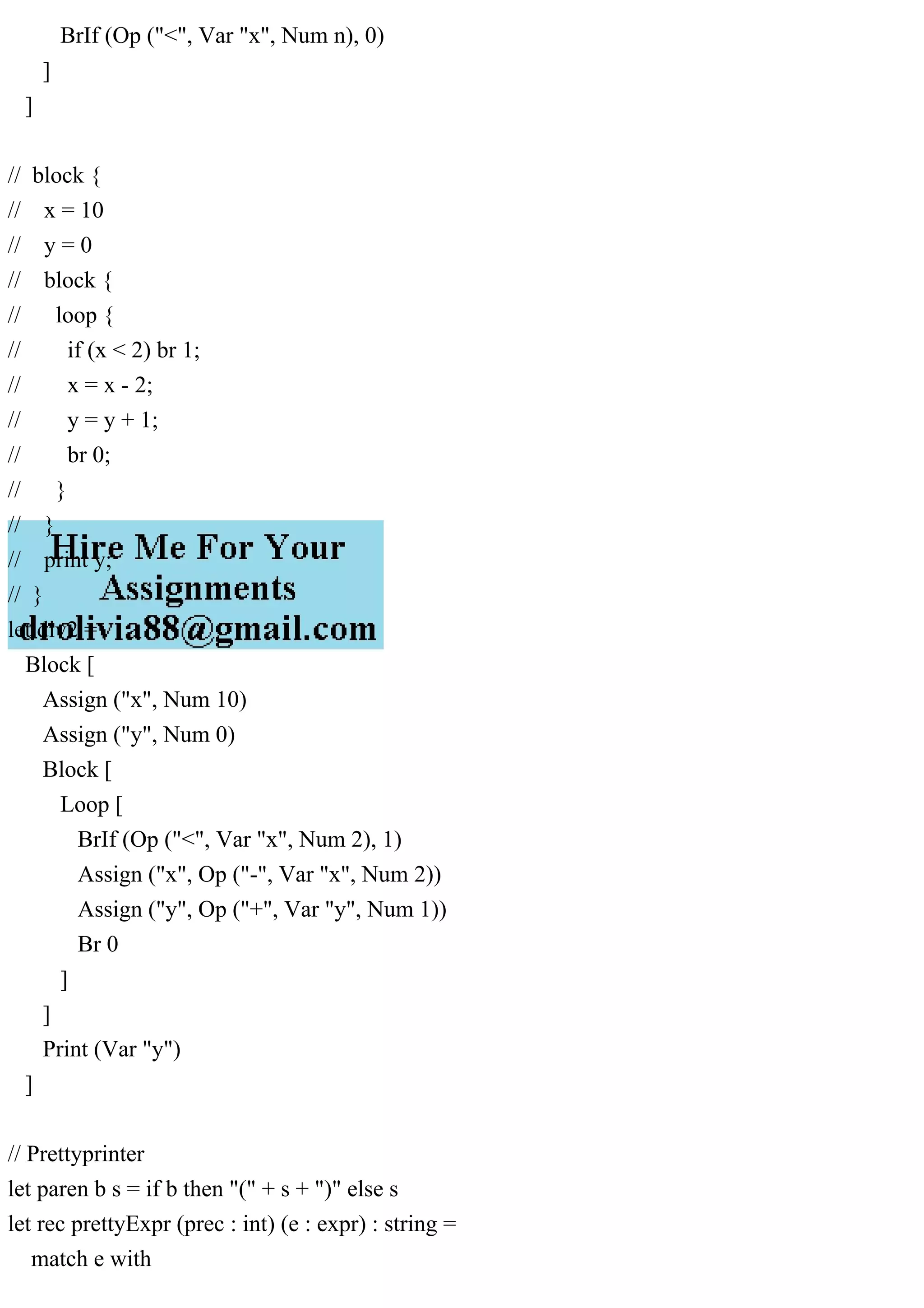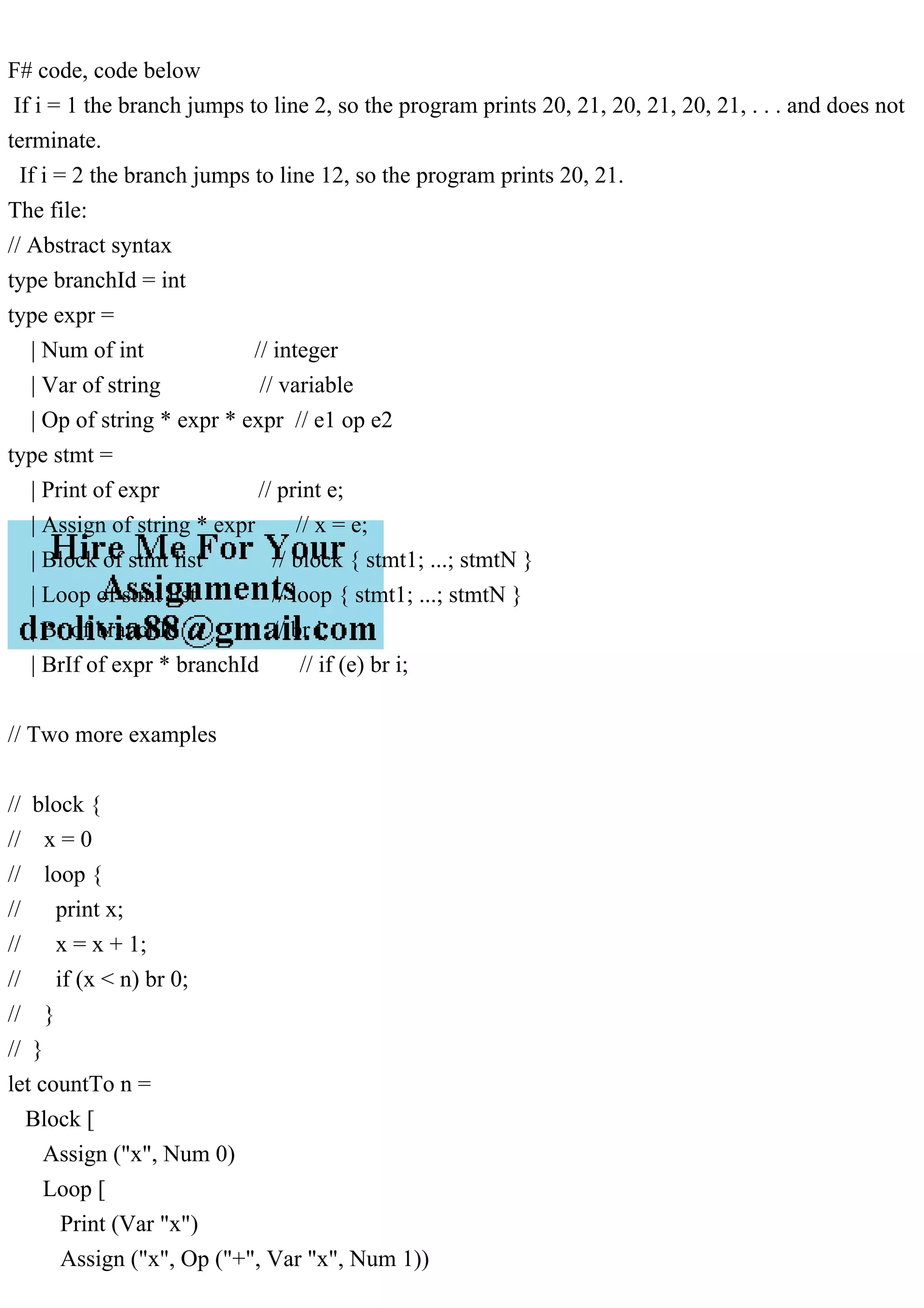 The document discusses a simple imperative programming language with control flow including blocks and branching statements, modeled in F#. It explains the functions and syntax for executing statements, handling loops, and branching behavior, alongside several code examples demonstrating their usage. Key features include conditionally branching to blocks and implementing if statements using only the provided branching mechanism.