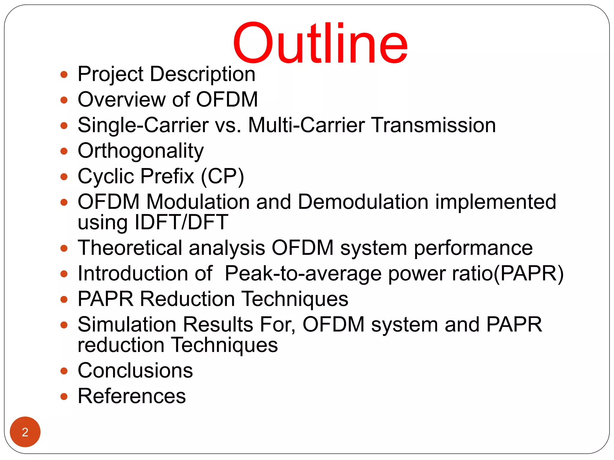 The document discusses the design and analysis of an OFDM (Orthogonal Frequency Division Multiplexing) system, focusing on the challenges of high Peak-to-Average Power Ratio (PAPR) and strategies for its reduction. It provides a comprehensive overview of OFDM, its advantages, various PAPR reduction techniques, and simulation results comparing the performance of these techniques. The conclusion highlights that while clipping is simple, techniques like Selective Mapping (SLM) and Partial Transmit Sequence (PTS) offer better performance, with PTS being computationally more efficient.