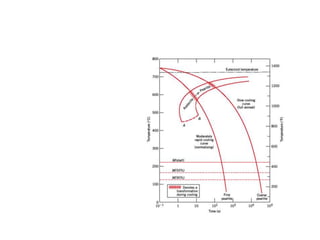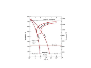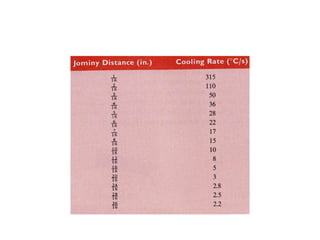 The document discusses hardenability, which is the ability of an alloy to form martensite and harden during heat treatment. It can be tested using the Jominy end-quench test, where a bar is heated and quenched at one end in water, causing a gradient of cooling rates and hardness levels along its length. Alloying elements like chromium, molybdenum, and nickel increase hardenability by shifting the CCT diagram to allow more martensite formation at a given cooling rate. The quenching medium, sample size, and alloy composition all impact the hardness profile achieved.