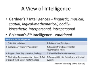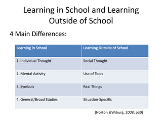 School learning focuses on linguistic and logical skills through direct instruction, while learning outside of school emphasizes more diverse intelligences like musical, spatial, bodily-kinesthetic, and interpersonal skills through indirect experiences. Howard Gardner's theory of multiple intelligences identifies 7 types of intelligence, with Daniel Goleman adding emotional intelligence as an 8th type. These multiple intelligences can help understand each learner's strengths and how they learn best, as students utilize different intelligences to learn, remember, and understand concepts.