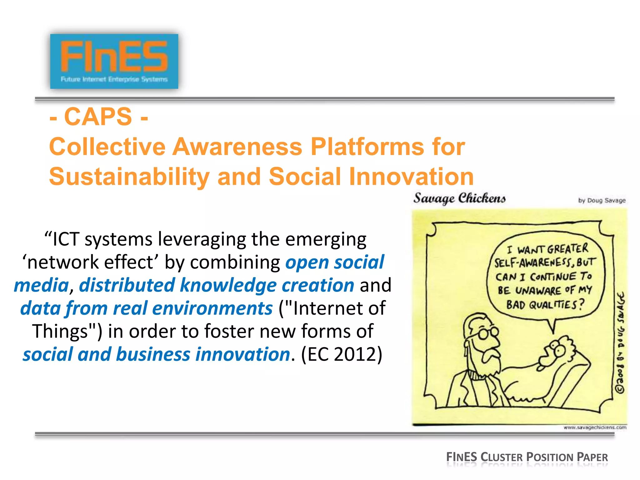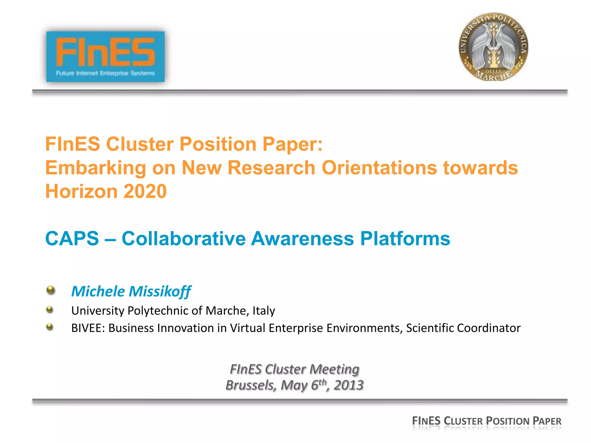 This document summarizes a position paper presented by Michele Missikoff on collective awareness platforms (CAPs). It discusses CAPs as ICT systems that leverage open social media and data from real environments to foster social and business innovation. It proposes a three-tier architecture for CAPs involving data acquisition, information aggregation, and strategic support. The document argues that CAPs could help transform the EU economy into a more knowledge-based one by facilitating knowledge sharing, collective intelligence, and a more people-centric approach. It calls for cross-disciplinary research that integrates technology, business, and social sciences to develop CAPs and enable new forms of sustainable and socially innovative enterprises.