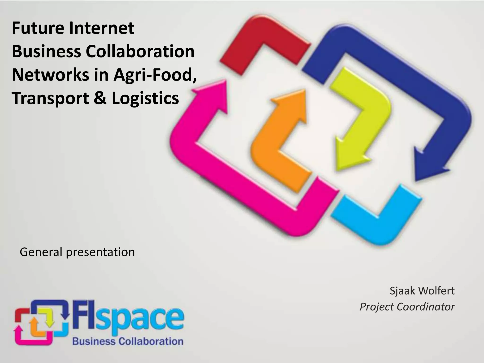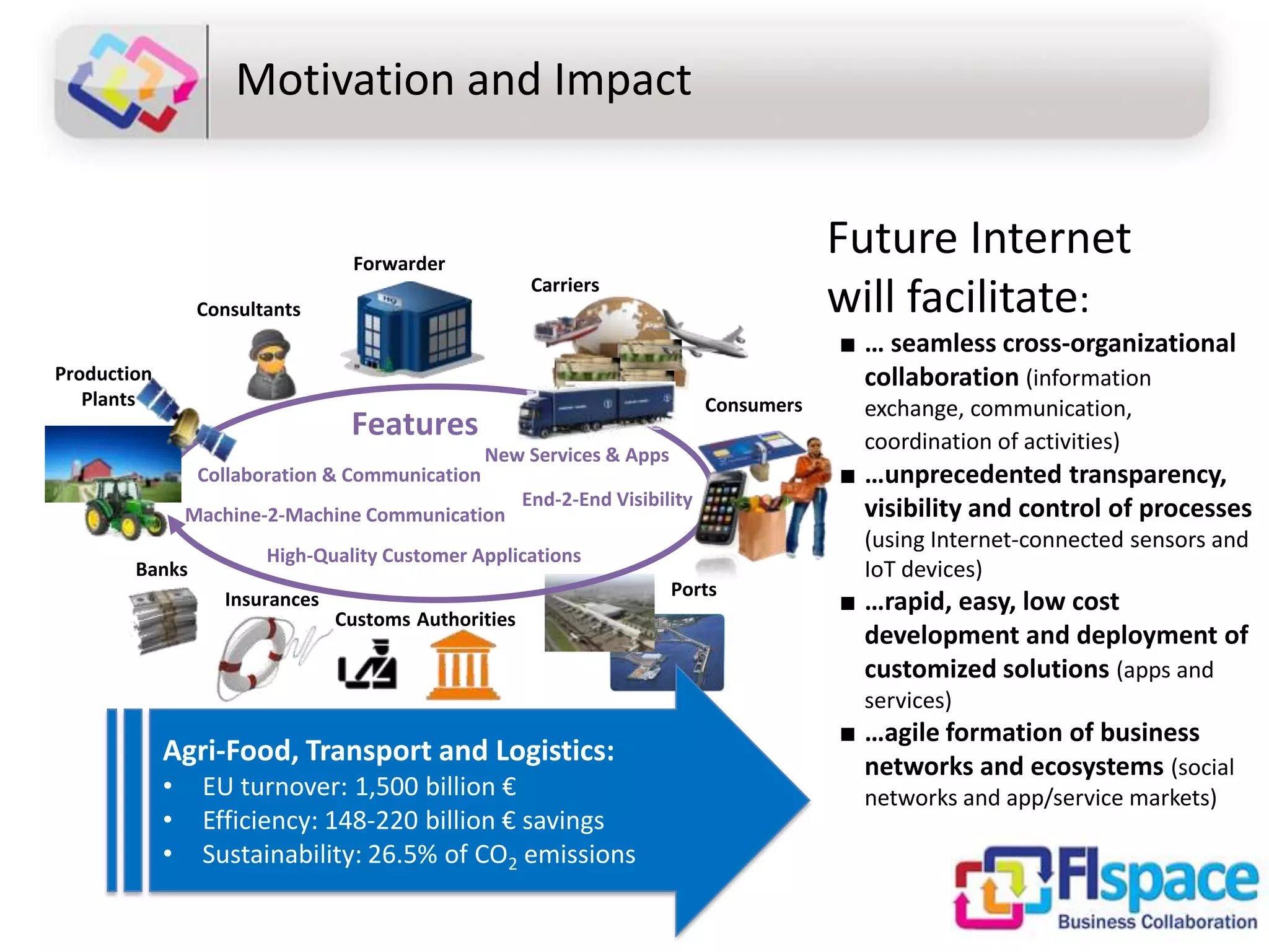 This document discusses the FIspace platform, which aims to facilitate seamless cross-organizational collaboration and unprecedented transparency in agri-food, transport, and logistics industries through machine-to-machine communication and Internet-connected sensors. The FIspace platform provides a cloud-based environment for collaborative business networks and on-demand applications. It integrates business systems through generic enablers and will be validated through use case trials in areas like crop protection information sharing, greenhouse management, and food supply chain monitoring.