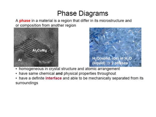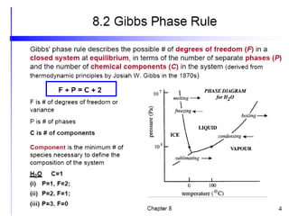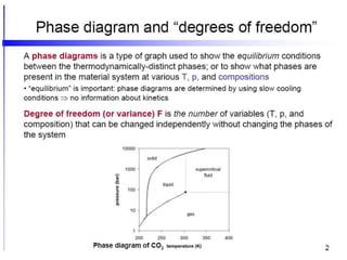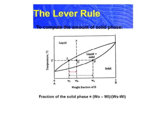 [3] The phase rule relates the number of phases, components, and degrees of freedom in a system. Lever rule calculations use tie lines on phase diagrams to determine the composition and relative amounts of coexisting phases.