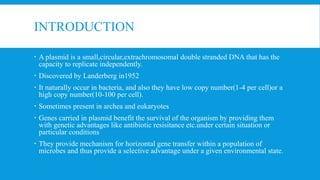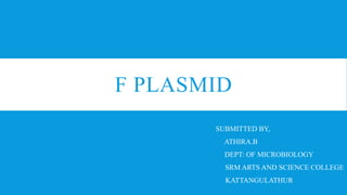 F plasmid is a conjugative plasmid found in Escherichia coli that was the first plasmid discovered. It plays an important role in bacterial reproduction by containing genes that code for the production of sex pili and enzymes required for conjugation. The F plasmid replicates through a rolling circle mechanism and transfers between bacteria via conjugation using an F pilus. During conjugation, the F plasmid unwinds and one strand is transferred to the recipient cell where it is replicated to form a double-stranded circular plasmid, converting the recipient into an F+ cell capable of plasmid transfer.