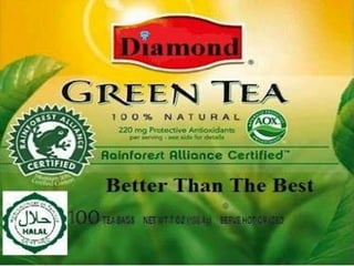 The document discusses Diamond Green Tea, its vision, benefits, SWOT analysis, competitors, segmentation, targeting, and positioning. It aims to make the tea available to all individuals by promoting good health and quality of life. The company focuses on quality, customer satisfaction, and continuous improvement. It targets the middle and upper classes in Pakistan and maintains its brand image through quality ingredients and wide availability.